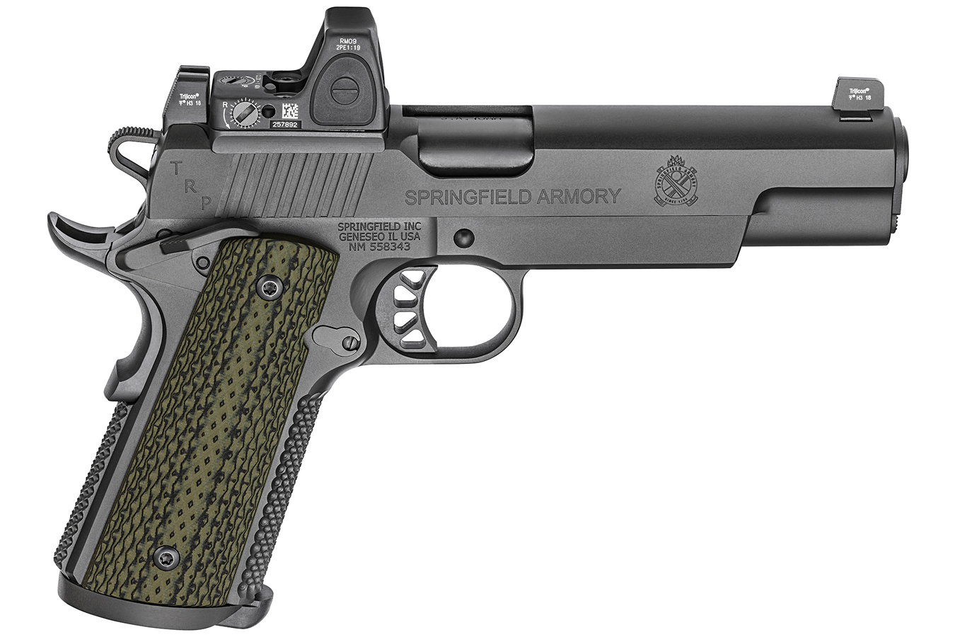 The Springfield Armory TRP 10mm RMR with a 5” barrel is now available with a Trijicon Ruggedized Miniature Reflex (RMR) sight specifically milled into the slide of Springfield Armory’s most elite production 1911. Springfield Armory chose Trijicon, the proven leader in rugged red-dot optics, for its ability to stand up to the power of the formidable 10mm round. The sight is crafted from 7075-T6 We ship to all US states — fast and discreet.