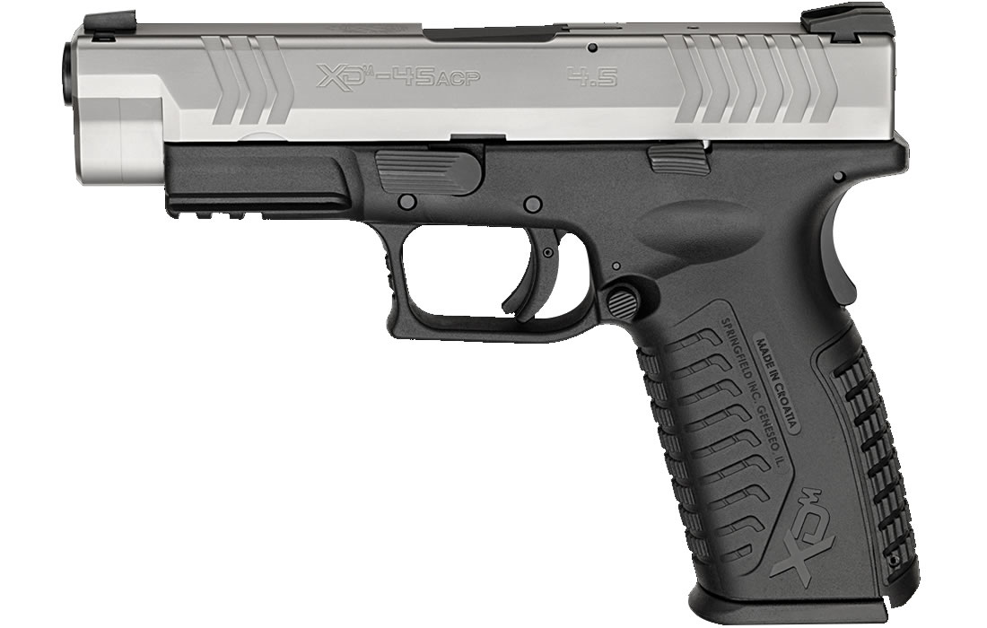 The springfield xdm 45acp 4.5 full-size bi-tone essentials package also includes a match-grade barrel and a fully supported feed ramp to enhance reliability with a variety of .45 ACP ammunition types.